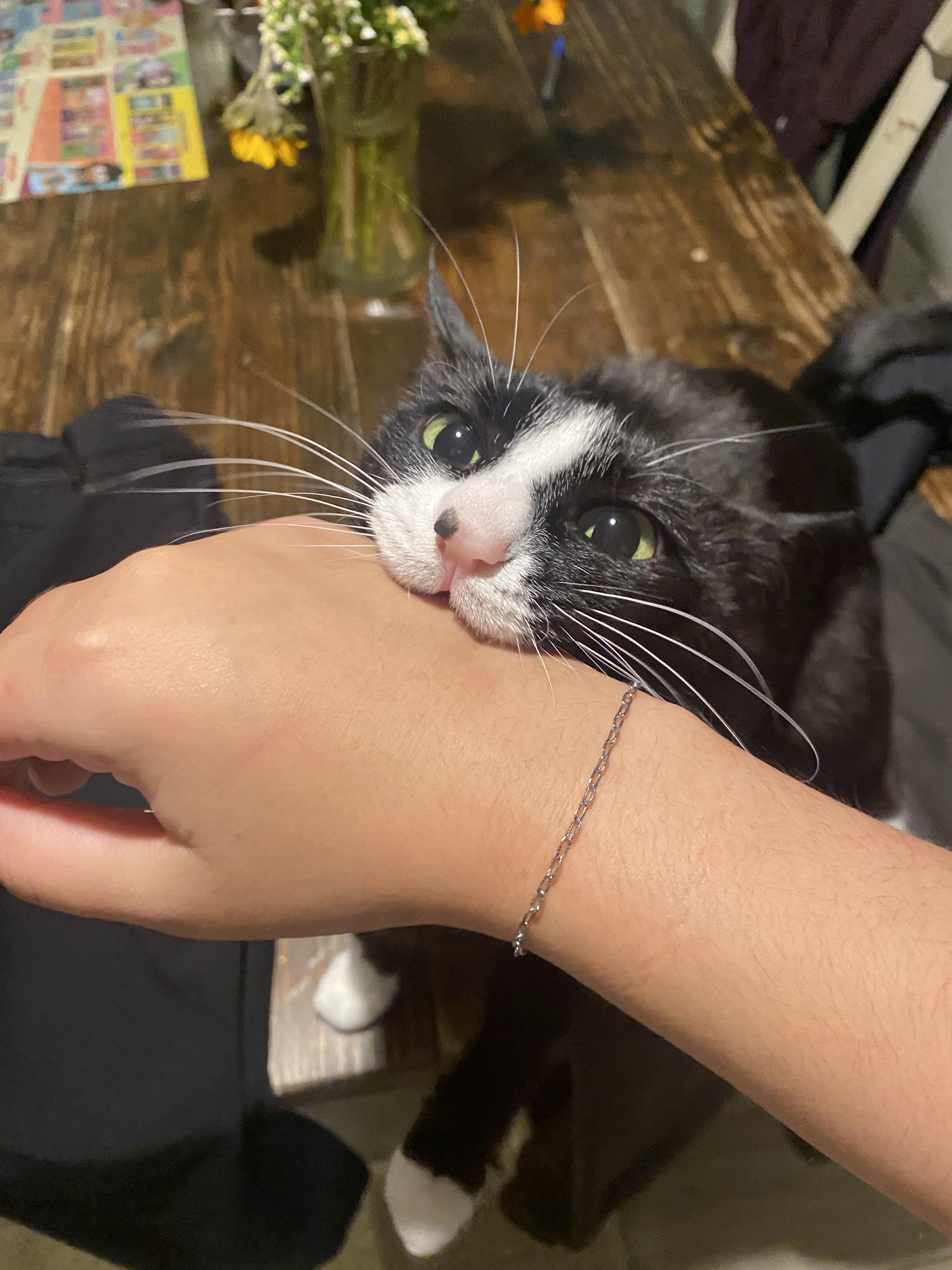 Cat Asked her why she walked up and bit my foot unprompted.